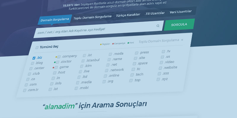 Alan adı sorgulama ekranının hemen altında yer alan domain uzantılarından dilediğiniz kadar uzantıyı seçerek sorgu işleminizi başlatabilirsiniz.